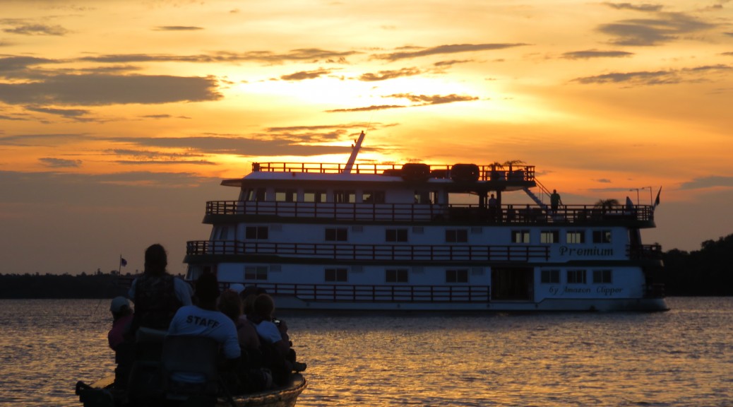 So now that I felt assured my creature comforts were not going to be uncomfortable, I felt safe enough to check out my surroundings. That’s when it really occurred to me—I was actually on a boat in the middle of the Amazon Rainforest, and it was spectacular! Did you know that every 100 km there is a different ecosystem? That means there are different species of trees and plant life, as well as different inhabitants and cultures, throughout the rainforest. We traversed the Amazon River and then explored one of its main tributaries, the Rio Negro. We took ‘canoes’ (a 16-seat long boat with an engine) every dawn and after sunset from the boat to tour smaller tributaries and explore the shorelines. We saw variety of birds, snakes, and reptiles (like gator relative the caiman) on every ride. We even had flying fish land in our canoes—usually after ricocheting off someone’s leg or chest!