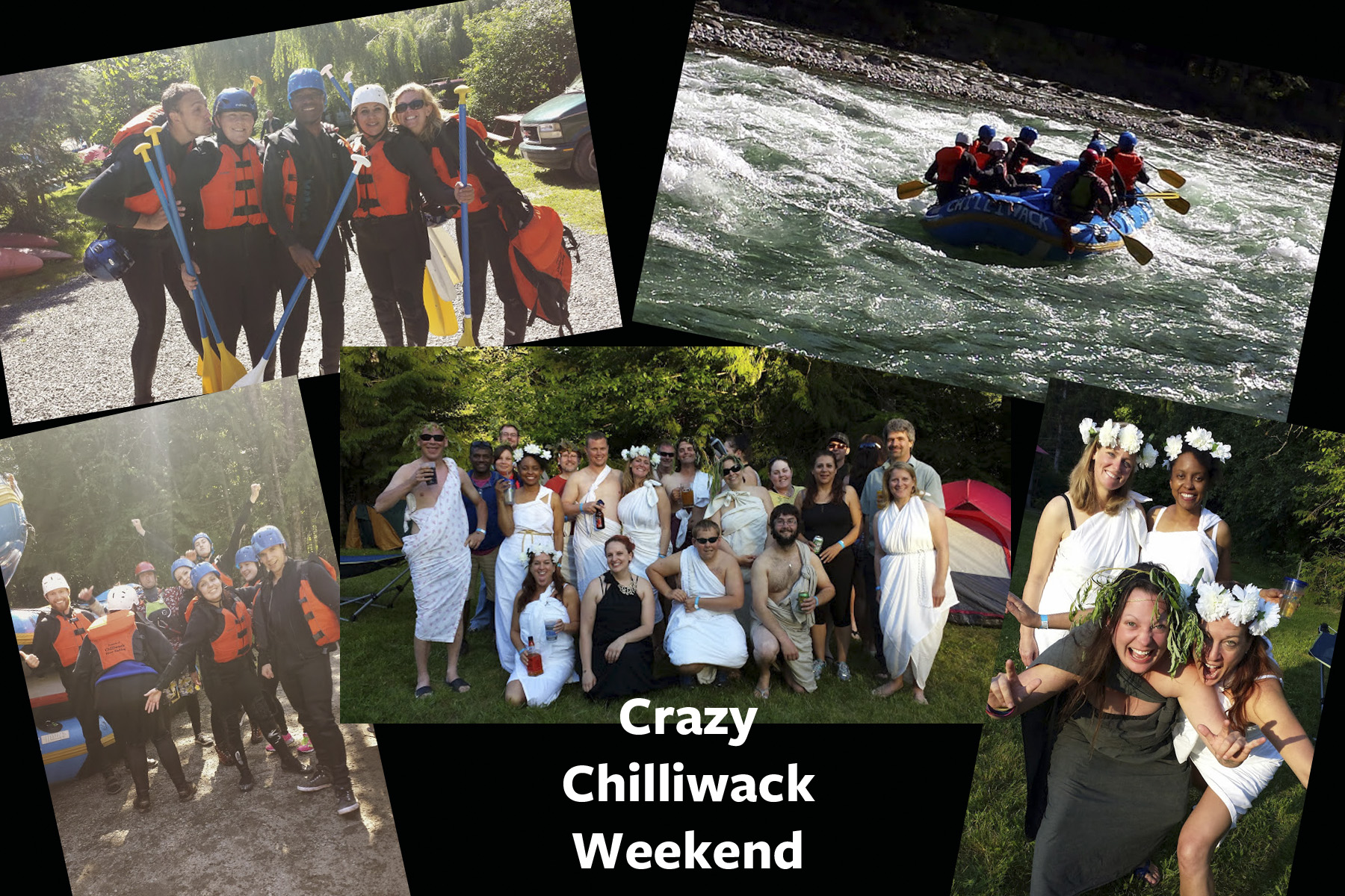 Ready to ramp it up Vancouver and Seattle Singles!!! Our overnight camping along the Chilliwack river was fun. Enjoying tasty meals, campfire and camaraderie was terrific . On the Chilliwack Classic , you always have the option to walk around the biggest rapids. The Chilliwack Canyon is 14 km of nonstop Mild action ( Classic ) or the Extreme rafters with its monster rapid waves for hard core rafters. So many ways to get wet and have fun. Of course we needed to camp overnight and get our party on after a hard day on the river, so why not have a Toga party?  We weren’t the only ones camping over so there was lots of milling about and great campfires all over the resort …..Nothing makes you more tolerant of a neighbors noisy party than being there.  Fun had by all on three different rafting trips.  A mild and hard core group on Saturday and another group conquered the class 4 waves on Sunday!!  Amazing as always was the Staff at Chilliwack River Rafting and of course the amazing group of members we had from both the Seattle and Vancouver Clubs